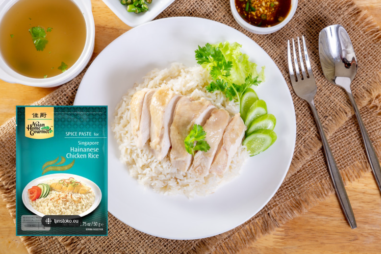 This Singapore signature recipe brings flavor and fragrance to rice with a touch of garlic, ginger and shallot. It is served with boiled or steamed chicken, chili sauce and tamari soy sauce.