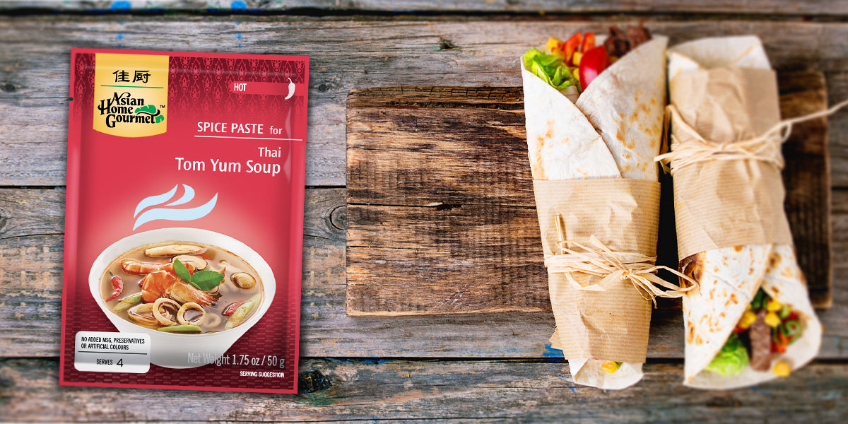 Whip up these Tom Yum Burritos? Don’t keep it to yourself. Tag Asian Home Gourmet on Facebook and show the world how you’re turning up the heat with Spice Paste for Thai Tom Yum Soup.