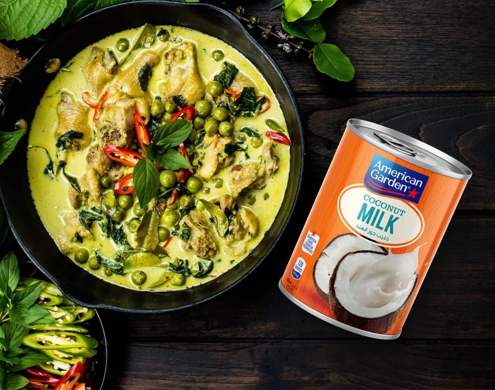 - Pour in American Garden coconut milk and simmer until the chicken is cooked through and the sauce thickens.