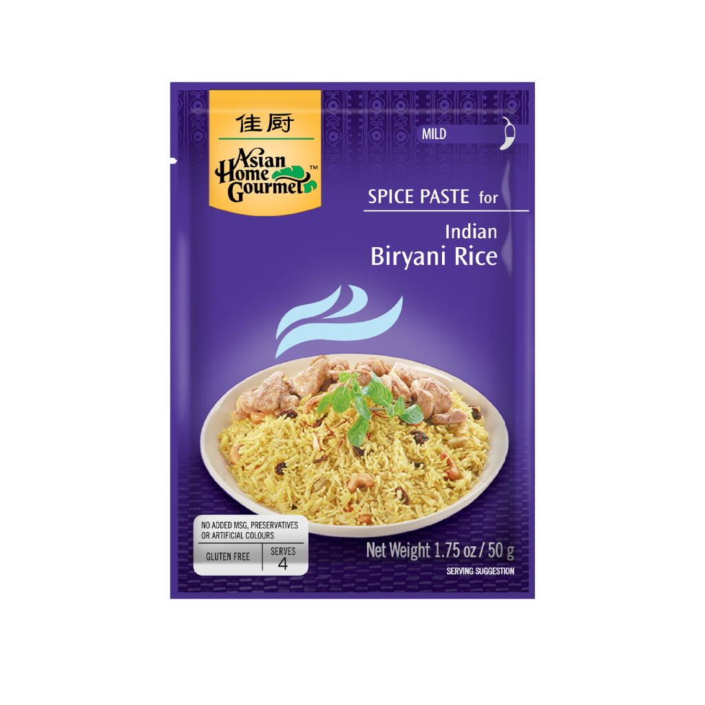 Asian Home Gourmet Indian Biryani Rice contains carefully selected spices such as coriander, ginger, and cumin and gives the rice a delicious spicy bite and a nice golden color. You can also use this sauce with basmati rice and add ingredients to taste like seafood, fish or meat and serve your biryani rice with a fruity mango chutney. Asian Home Gourmet pastes and mixes contain no flavor enhancers, preservatives or artificial colors. Available in 50g sachets.