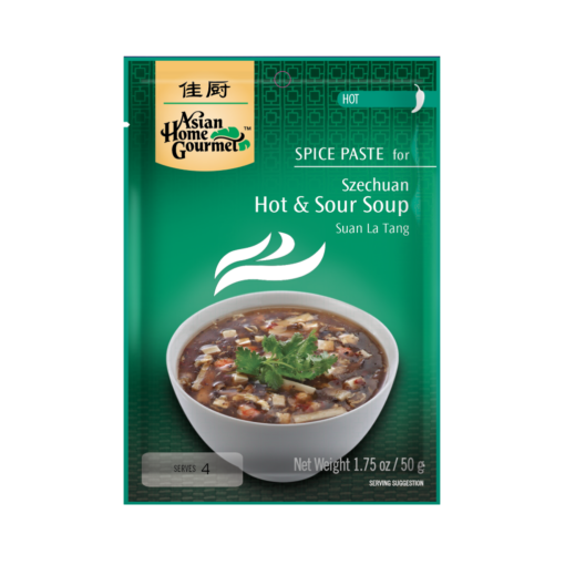 Asian Home Gourmet?s Szechuan Hot & Sour soup originates from the Sichuan province in China. With this hot and spicy soup paste, authentic Chinese soup can be prepared. You can combine the soup with chicken, noodles, or vegetables. This hot & sour soup can serve as a starter and is also a nutritious meal alone! Asian Home Gourmet pastes and mixes contain no flavor enhancers, preservatives or artificial colors. Available in 50g sachets.