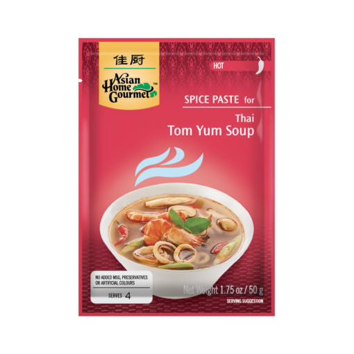 Tom Yum Soup is a Hot and Sour Thai dish that is usually enjoyed with Shrimp. Asian Home Gourmet Thai Tom Yum Soup is made of a blend of lemongrass and chili peppers thatwill surely give you the flavoring you need in a quick and easy way! Asian Home Gourmet pastes and mixes contain no flavor enhancers, preservatives or artificial colors.Available in 50g sachets.