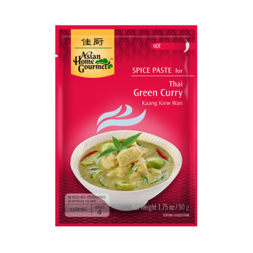 Asian Home Gourmet’s Thai Green Curry paste is the spiciest Thai curry there is. This paste is a mixture of herbs and spices that enrich your curry dish with a hot and spicy flavor. This paste goes perfectly with seafood, chicken, or beef. Experience the authentic Thai taste with the aroma of lemongrass and basil that are all natural!Asian Home Gourmet pastes and mixes contain no flavor enhancers, preservatives or artificial colors. Available in 50g sachets.